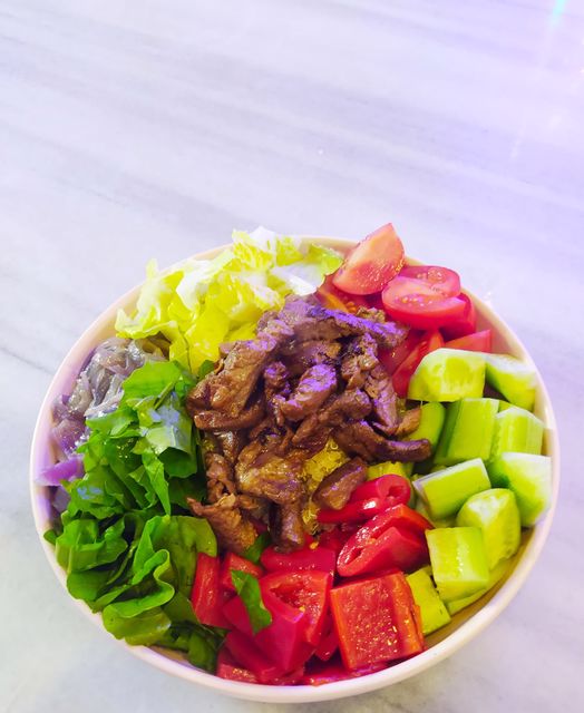 Dana Bonfile, Kinoa, Karamelize Soğan, Közlenmiş Kırmızı Biber, Roka, Marul, Salatalık ve Cherry